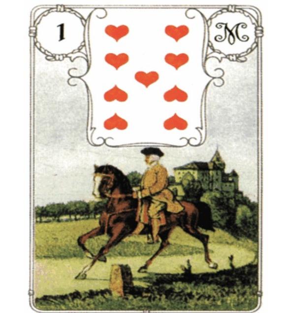 Карта указывает на скорые новости, будь то издалека или связанные с домом. Возможно, вам кто-то позвонит, либо новости придут по почте. Как бы то ни было, вы скоро получите ответ или отклик. Всадник всегда появляется, когда кто-то приезжает или в жизни появляется какой-то новый человек. В большинстве случаев карта соотносится с новостями, любой новой информацией. Она может означать приход почтальона или сотрудника службы доставки, новое знакомство. Это также карта движения как в плане прибытия, так и в плане ухода. Человек приносящий сообщения может быть иностранцем. Карта считается благоприятной, означает успешное развитие дел. Если всадник рядом с картой спрашивающего- сообщение придет от знакомого человека, если далеко- от незнакомца из далека. Когда выпадает всадник в окружении благоприятных карт- это хорошее предзнаменование и означает благоприятные перспективы.