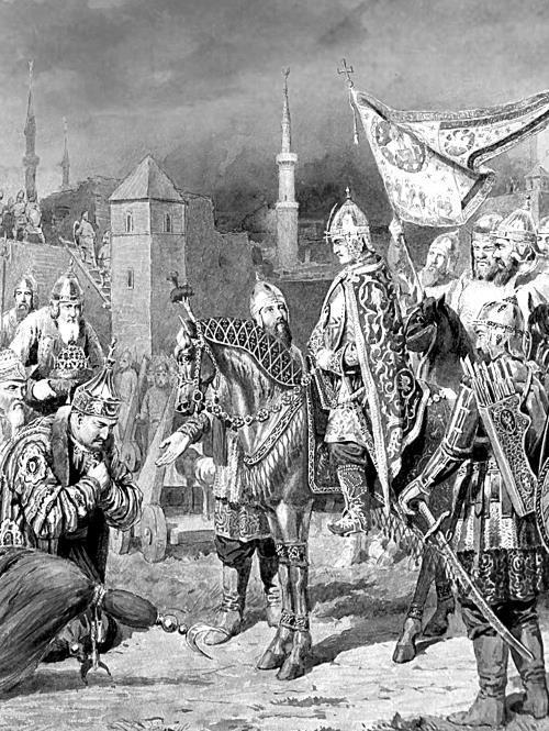 В Москве условия договора не были опубликованы; русским было известно, что «царь Улу-Махмет и сын его утвердили великого князя крестным целованием, что дать ему с себя окуп, сколько может. А иное бог весть и они между собою…». В народе распространились самые тревожные слухи. Говорили, что Василий обещал отдать хану все Московское княжество, а себе оставил лишь Тверь. Еще до возвращения великого князя из плена против него назревало возмущение – народ не желал признать заключенного им договора. С Василием прибыло в Москву 500 казанских людей – «князья татарские со многими людьми». Они были назначены на различные административные должности и получили в кормление волости и города. С.М. Соловьев по этому поводу говорит: «И прежде Василий принимал татарских князей в службу и давал им кормление – средство превосходное противопоставить варварам варваров же… но современники думали не так: мы видели, как они роптали, когда при отце Василия давались литовским князьям богатые кормления; еще более возмутили их негодование подобные поступки с татарами, потому что в них не могла еще тогда погаснуть сильная ненависть к этому народу, и когда к тому же были наложены тяжкие подати, чтобы достать деньги для окупа»9. К этому времени относится выделение татарам в Мещерской земле (на Оке) особого удела – так называемого Касимовского царства, отданного, вероятно, в силу условий того же мирного договора во владение сыну Улу Мухаммеда царевичу Касиму. На образование этого удела нельзя смотреть как на добровольную меру русского правительства, – напротив, оно явилось одним из главнейших результатов одержанной Улу Мухаммедом победы и первой попыткой ханов татарских вступить в непосредственное управление на Русской земле в качестве удельных князей. Русские историки имеют обыкновение изображать положение татарских царевичей, служивших в России в качестве удельных князей, унизительным и ничтожным. По отношению к касимовским царевичам это совершенно неприменимо: напротив, этим татарским ханам, севшим на Русской земле, московские и рязанские великие князья были обязаны платить дань – «выход» – совершенно так же, как они платили дань в Сарай и Казань, а впоследствии в Астрахань и еще в Бахчисарай. Об уплате рязанскими князьями постоянной дани касимовским государям «по старым дефтерем, по крестному целованию» говорится в договоре рязанских князей Ивана и Федора Васильевичей от 19 августа 1496 года10. Дань русского правительства в пользу касимовских ханов упоминается в договоре между сыновьями Ивана III от 16 июня 1504 года11 в завещании Ивана III 1594 года12 и была в полной силе еще при Иване IV, после покорения Казани, когда Россия торжествовала свою победу над татарами: «выход в Царевичев городок» упоминается в числе обязательств, принятых на себя князем Владимиром Андреевичем Старицким по отношению к Ивану IV от 12 марта 1553 года – «как дед наш князь великий Иван в своей духовной написал», наряду с выходами в Крым и Астрахань13. Русские историки не без удивления констатировали этот факт уплаты русскими государями дани касимовским ханам, которые обычно рисуются жалкими подручниками московских великих князей и царей и безвольными исполнителями их приказаний. Вельяминов-Зернов говорит: «Оказывается, что в Царевичев Городок (Касимов), в пользу управлявшего им цар