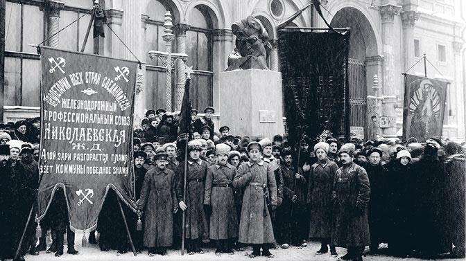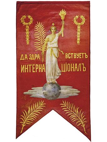 Другим вариантом аллегории революционной свободы был неоклассический женский образ в белых античных одеждах и лавровом венке, соединенный с символами нового мира и прогресса (земной шар, фабрика с дымами, локомотив, солнце и др.). Так, на знамени железнодорожного цеха Путиловского завода (1917, ГМПИР) эта фигура была изображена стоящей на земном шаре как символ интернационала, с горящим факелом и пальмовой ветвью в руках7, а на знамени Главных мастерских Северо-западных железных дорог (1917, ГМПИР) она благословляет рабочего, разбившего свои цепи, с трона — земного шара. Восходящее солнце согревает своими лучами движущиеся поезда и надпись «Пролетарии всех стран, соединяйтесь! Да здравствует республика и социализм!»8.
