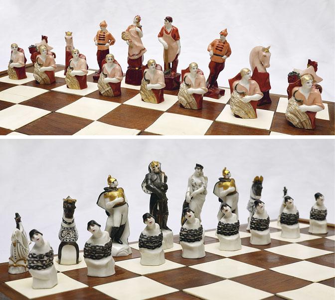 Шахматы «Красные и белые». Автор моделей Н. Данько. Фарфор, надглазурная роспись, позолота, серебрение, цировка. Пг. — Л.: ГФЗ, 1925, 1932.