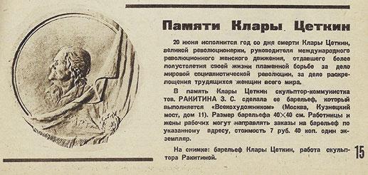 Редкий пример тиражного мемориального портрета революционерки: Ракитина З. Барельеф памяти Клары Цеткин. Журнал «Работница», 1934, № 13