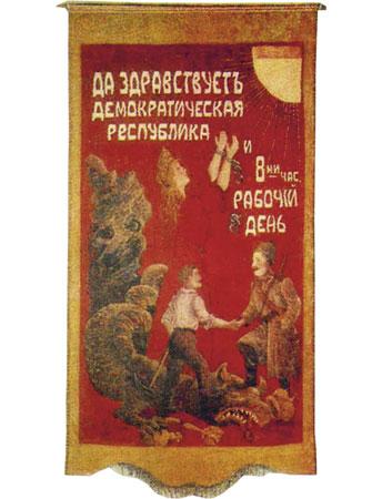 Знамена украшались не вышивкой или аппликацией, а живописью. Это были двусторонние вертикальные полотна красного цвета, отделанные бахромой и золотой или красной шелковой каймой. На лицевой части обычно помещалось аллегорическое изображение России или Свободы, на обороте, если он был, — композиция на индустриальную тему. Такова роспись знамени Трубной мастерской Ижорского завода (1917, ГМПИР), отсылающая к мифу о Персее и Андромеде. Свободная Россия в кокошнике и красном сарафане протягивает с утеса к восходящему солнцу руки в разбитых кандалах. У подножия скалы покоится символ самодержавия — чудище с отрубленной головой, которое попирают ногами рабочий и солдат, скрепляющие свой союз рукопожатием; у их ног — упавшая императорская корона. Лозунг, нанесенный белой краской, гласит: «Да здравствует демократическая республика и 8-ми часовой рабочий день»4. На знамени Северо-западных железных дорог (1917, ГМПИР) женская фигура в русском костюме представлена на фоне якоря, в ее руке — знамя «Пролетарии всех стран, соединяйтесь». В нижнем регистре композиции рабочий-молотобоец стоит у разорванных цепей, вдали видны силуэты паровоза и здания депо. Центральную часть занимает лозунг «Да здравствует интернационал», освещенный лучами солнца5.
