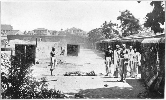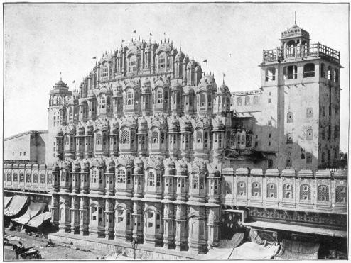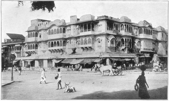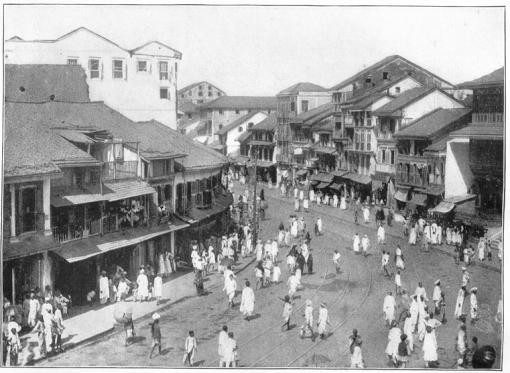 The Eye of India, as Bombay is called, sits on an island facing the Arabian Sea on one side and a large bay on the other, but the water is quite shallow, except where channels have been dredged to the docks. The scenery is not attractive. Low hills rise in a semicircle from the horizon, half concealed by a curtain of mist, and a few green islands scattered about promiscuously are occupied by hospitals, military barracks, villas and plantations. Nor is the harbor impressive. It is not worth description, but the pile of buildings which rises on the city side as the steamer approaches its dock is imposing, being a picturesque mingling of oriental and European architecture. Indeed, I do not know of any city that presents a braver front to those who arrive by sea. At the upper end, which you see first, is a group of five-story apartment houses, with oriental balconies and colonnades. Then comes a monstrous new hotel, built by a stock company under the direction of the late J. N. Tata, a Parsee merchant who visited the United States several times and obtained his inspirations and many of his ideas there. Beside the hotel rise the buildings of the yacht club, a hospitable association of Englishmen, to which natives, no matter how great and good they may be, are never admitted. Connected with the club is an apartment house for gentlemen, and so hospitable are the members that a traveler can secure quarters there without difficulty if he brings a letter of introduction.