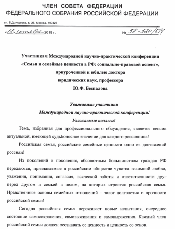 Вашему вниманию предлагается сборник научных докладов и сообщений участников Международной научно-практической конференции на тему «Семья и семейные ценности в РФ: социально-правовой аспект», приуроченной к юбилею доктора юридических наук, профессора Юрия Федоровича Беспалова.