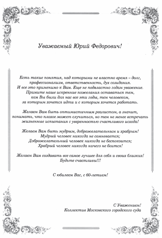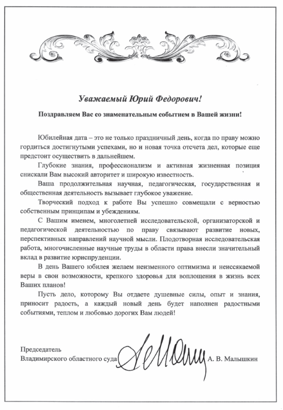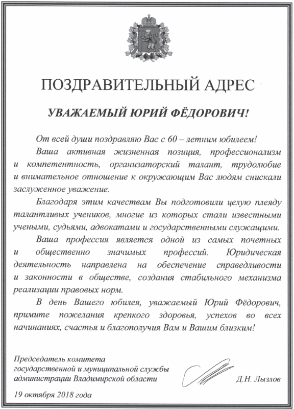 1.5. Поздравительный адрес председателя комитета государственной и муниципальной службы администрации Владимирской области Д. Н. Лызлова