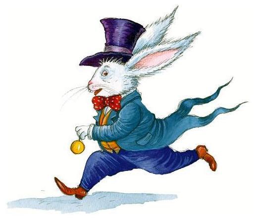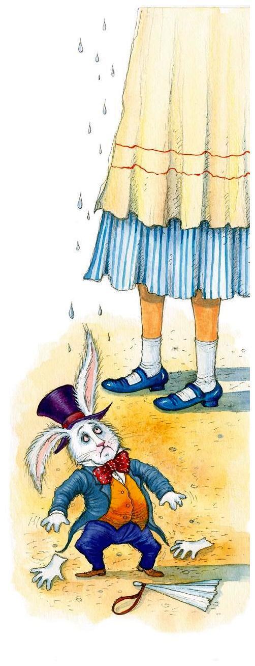 Вдруг издалека раздался едва слышный топоток, причём с каждой минутой он становился всё отчётливее. Алиса торопливо вытерла глаза – надо же посмотреть, кто это там. Оказалось, что это Белый Кролик. Разодетый, с парой белых лайковых перчаток в одной лапе и с большим веером в другой, он очень торопился и на ходу бормотал себе под нос: