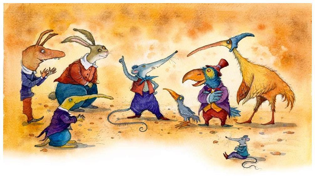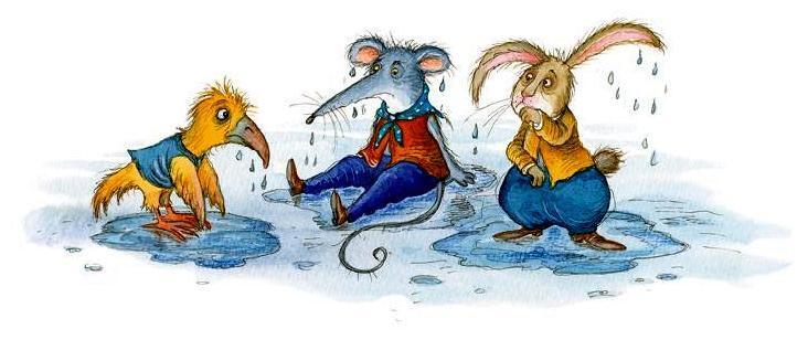 Странное общество собралось на берегу: птицы с перепачканными в грязи перьями, животные со слипшейся шерстью. Все они вымокли так, что с них стекала вода, и вид у всех был мрачный и несчастный.