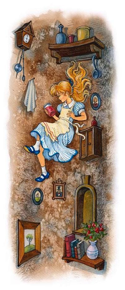 Внизу ей разглядеть ничего не удалось: сплошная чернота – тогда она стала рассматривать стены колодца. Её взору предстали шкафы с книгами, и полки с посудой, – и что уже совсем удивительно – географические карты и картины. Пролетая мимо одной из полок, Алиса схватила стоявшую на ней банку и увидела бумажный ярлычок с надписью: «Апельсиновый джем». Однако, к величайшему огорчению Алисы, банка оказалась пустой. Сначала она хотела просто бросить её, но, побоявшись попасть кому-нибудь в голову, ухитрилась поставить на другую полку, мимо которой пролетала.