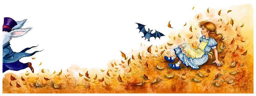 И вдруг – хлоп! – Алиса приземлилась на кучу листьев и сухих веток, но ни капельки не ушиблась и тотчас же вскочила на ноги. Посмотрев вверх, она ничего не увидела – над головой была непроглядная темень. Осмотревшись вокруг, Алиса заметила прямо перед собой длинный тоннель, а ещё увидела Белого Кролика, который со всех ног улепётывал по этому тоннелю. Нельзя было терять ни минуты. Алиса помчалась за ним и услышала, как он, поворачивая за угол, пробормотал: