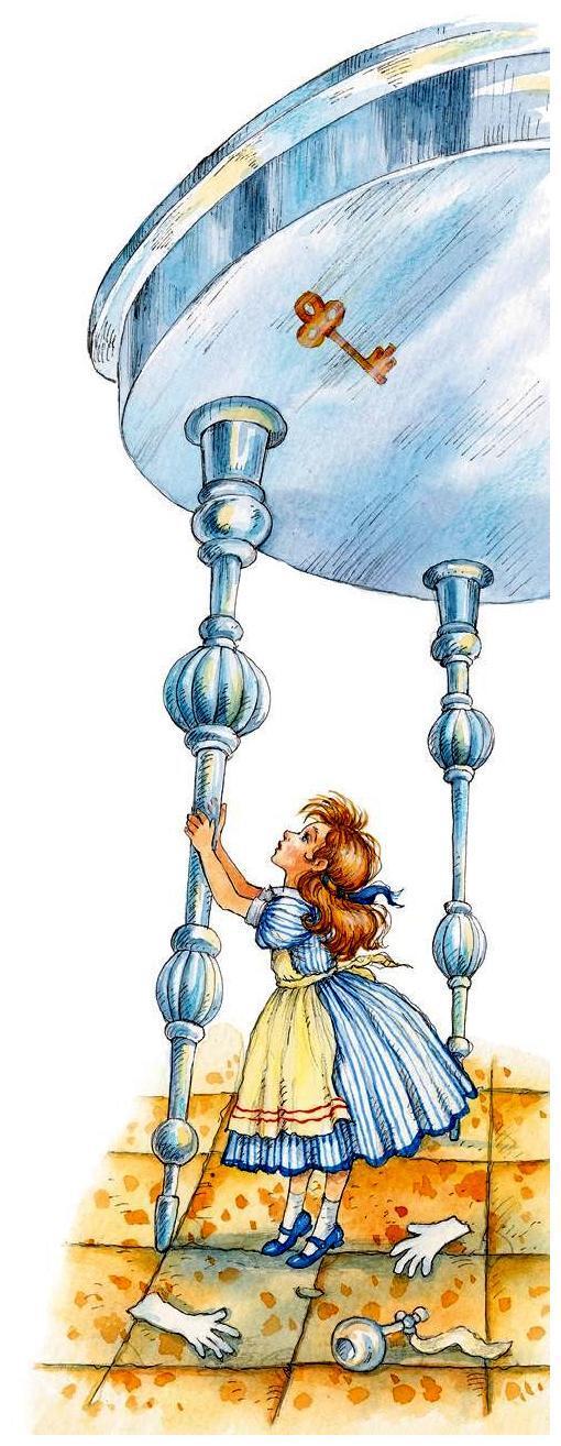 Горестно вздохнув, Алиса опустила глаза и с удивлением обнаружила, что сама не заметила, как надела на руку крошечную перчатку Кролика. «Должно быть, я опять стала маленькой», – подумала она и бросилась к столу, чтобы выяснить, какого же теперь она роста.