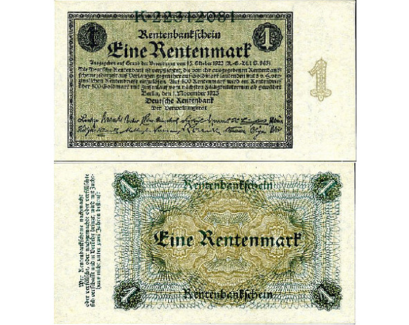 1923. aasta novembris on Saksa marki määr 4,2 triljonit USA dollarit. 1924. aastal, paralleelselt sellele, mitteametlik rahaühik — nn. kinnisvara tagatisega tagatud rendimärk. Tavaliseks kaubamärgiks on üks kuni üks triljon. Paar kuud hiljem, on õigustatud riigimark (RM), mis on võrdne selle nimiväärtusega ja nii need valuutad, et mitte kahjustada usaldust elanikkonnast, jääda ringlusse. Maksumus ühe RM — 2,5 grammi puhast hõbe, mis praeguse kiirusega umbes 150 rubla. Välimus need arved peatab hüperinflatsioon (5000% palgast — kaks korda päevas, inimesed nälgivad).