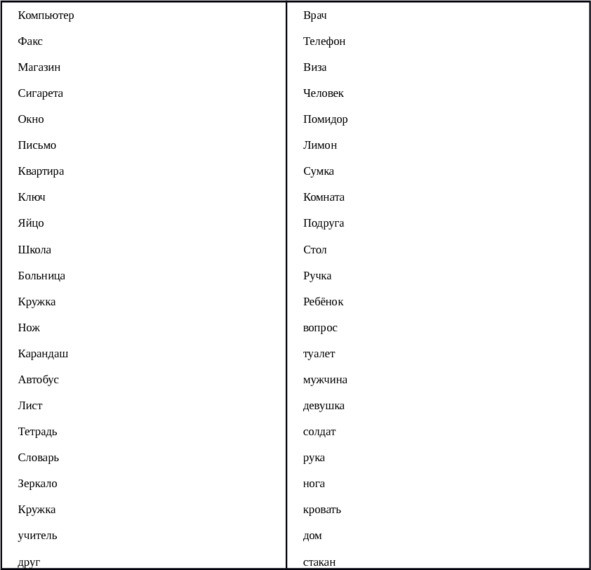 Сестра, брат, машина, скайп, интернет, компьютер, телевизор, собака, окно, молоко, паспорт, виза, кошка, ручка, туалет, пиво, Япония, Китай, Россия, университет.