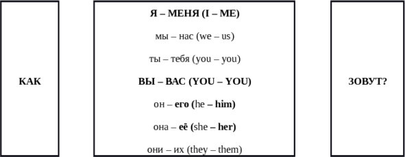 — Как… зовут? (What is….name?) — Меня зовут Татьяна. (My name is Tatyana) — Очень приятно. (Nice to meet you). — Меня зовут … (My name is ……)