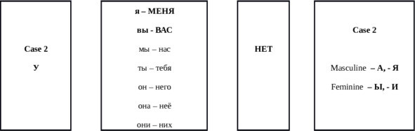 When the stem of a noun of feminine gender ends in a soft consonant or in К, Г, Х, Ш, Щ, Ж, then the ending is И. When it ends in other letters, then the ending is — Ы. However, it doesn’t matter, if you replace –А with –Я, and –Ы with –И, it won’t be very noticeable when pronounced-)! The MAIN THING, that you should memorize: in case of positive answer to the question in the model “У вас есть..?” the ending of a noun does not change. At the negative answer the noun’s ending ALWAYS changes. It depends on the gender of a noun. Noun’s ending varies in six cases in Russian. So, at the positive answer we use case 1 (the nominative form, the noun’s ending doesn’t change), at the negative answer we use case 2 (the noun’s ending changes to the second ending in relation to the gender of noun).