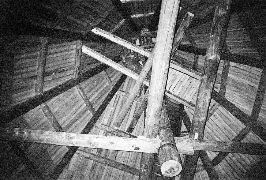 Стропильный шатёр. Видны осевой столб и связевые балки