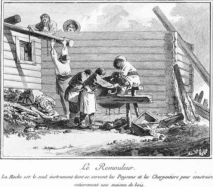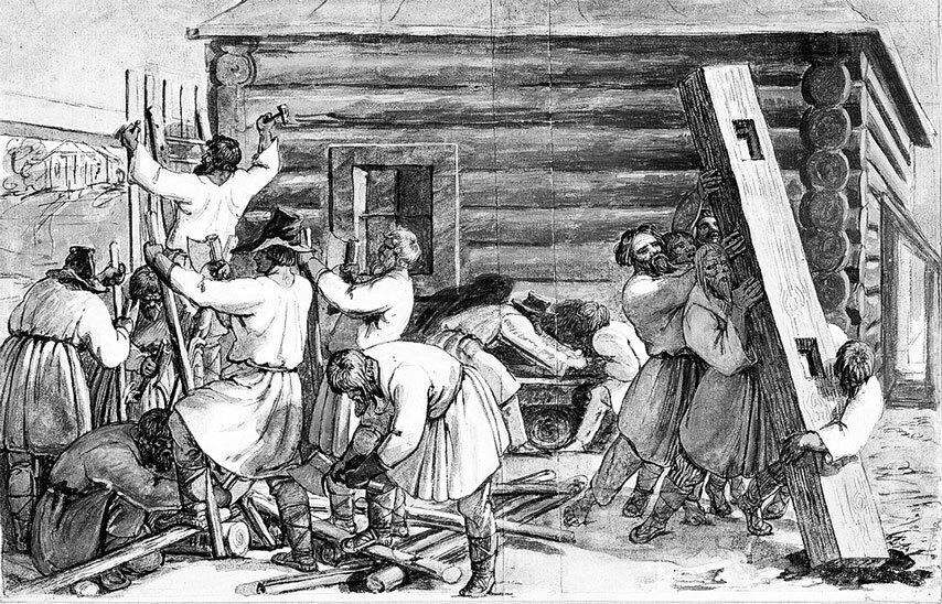 Г. Оэри. Русские крестьяне строят избу. 1810-е гг.
