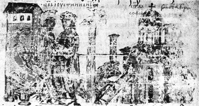 Строительство Святой Софии. Миниатюра из хроники Константина Манассии