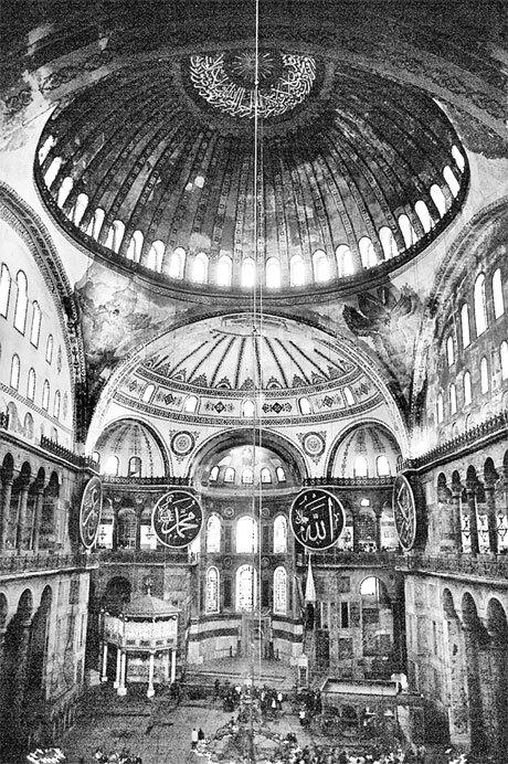 Художественное творчество Византии, как известно, наиболее мощно развернулось именно в области архитектуры. Византийцы систематически разрабатывали основания купольной архитектуры и в VI веке, в куполе собора св. Софии в Константинополе, создали единственный в своем роде образец сооружений этого рода, на протяжении многих веков привлекавший внимание архитекторов всего мира. Правда, после создания этого купола византийское зодчество начинает медленно идти на убыль, но, несмотря на это, его влияние распространяется на всю Европу, на все христианские страны. Не остается в стороне от этого влияния и Россия XI века с ее исключительно деревянным зодчеством.