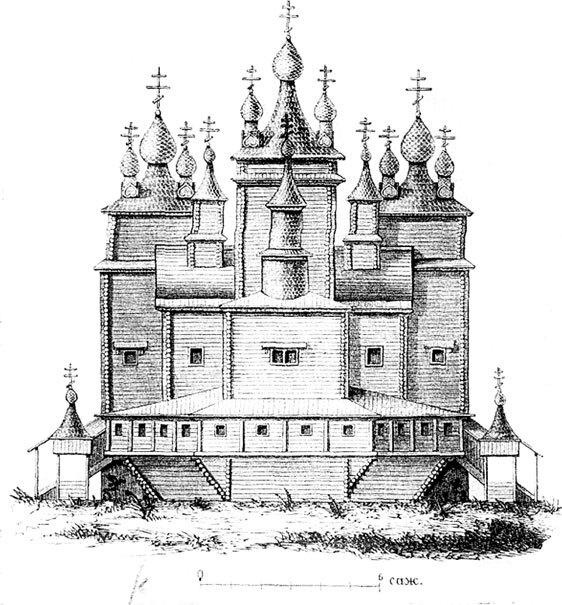 В основу планов деревянных соборов полагалась та же идея, что и в постройку хором. Как хоромы являлись в сущности собранием отдельных, связанных между собою хоромин, так и собор представлял собою собрание церквей. Так же, как в хоромах, здесь к основной, главной клети прирубались боковые – «приделы». От этих пристроек здание собора приобретало очертания креста, становилось «кресчатым» храмом. Каждая из пристроек-приделов имела свою главу. Нередко главы, размером поменьше, ставились над алтарями.