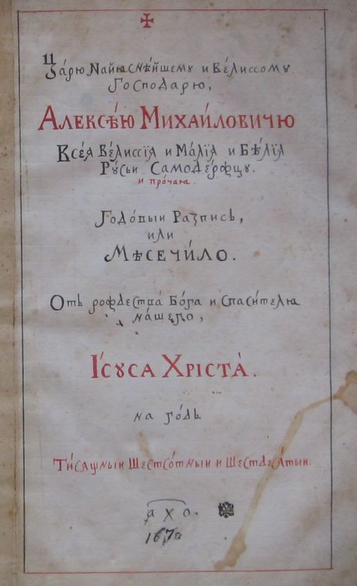 Принцип построения календаря схож с польскими календарями и прогностиками. На титульном листе «Царю найяснейшему и великому господарю Алексею Михайловичю всея Великия и Малыя и Белыя Русьи самодержцу и прочая, Годовый разпись, или Месечило. От рождества Бога и Спасителя нашего Иисуса Христа на год тисящный шестсотный и шестдесятый. 1660». В документе видны более поздние исправления на «1670».