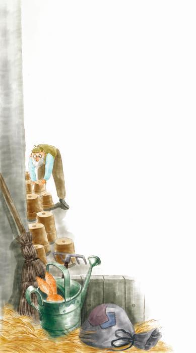 Мистер Мак-Грегор и не сомневался в том, что Питер прячется где-то в сарае, ну, например, под пустым цветочным горшком. Он начал осторожненько переворачивать цветочные горшки, заглядывая под каждый из них.