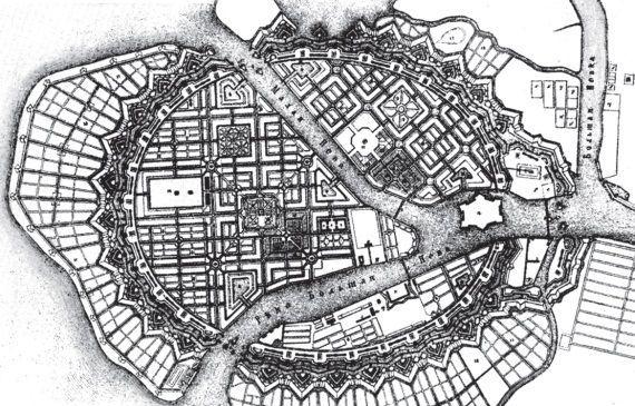 Адмиралтейство задумывалось Петром как крупнейшее по тем временам промышленное предприятие – верфь и как крепость, не просто оберегающая невское побережье, но способная своим огнем взаимодействовать с крепостью на Заячьем острове, создавая при входе в Неву непреодолимую огневую преграду. Чертеж Адмиралтейства, исполненный собственноручно Петром и содержащий множество его указаний о размещении мастерских и подсобных помещений, сохранился в архиве. Задумывался грандиозный производственный комплекс, открытый на Неву и окруженный земляными валами, стенами и рвом. Длина его вдоль Невы равнялась 200 саженям (425 м), ширина – 100 саженям.