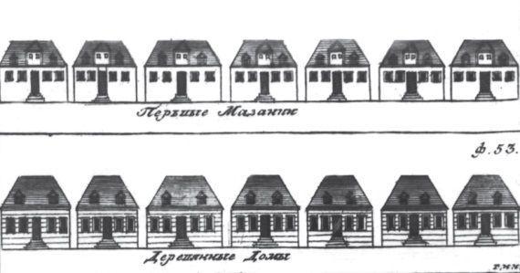 Особенно интересна практика создания для «обывательского» строительства в Петербурге домов по «типовым проектам» (их называли «обрасцовые дома» или «манерные дома»). В мае 1717 года Пётр из-за границы прислал «черчеж, по которому всем, на реку строящемся, строить таковым образом»… Архитекторы Леблон, Трезини, Гербель составили проекты таких домов для разных социальных групп – от «именитых» до «подлых» (слово означало человека, платящего подати).
