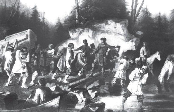 Двинулись 17 августа. Шли десять дней. Выбивались из сил, страдали от ненастья, постоянных дождей, тянули корабли и грузы по кладям через болота, по просекам через лесные дебри, переправлялись через встречавшиеся на пути реки. Но ночам отдыхали под открытым небом на привалах – «ямах», где только для «особ» были приготовлены «зимушки», а все остальные просто согревались у костров на заранее приготовленных для этого дощатых помостах. Вековая тишина леса и «мхов» нарушалась шумом, производимым тысячами людей, в облачное небо поднимался дым сотен костров.