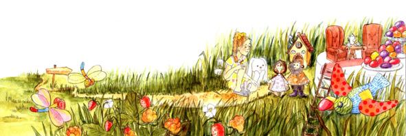 — Пойдёмте, пойдёмте к столу! — радостно размахивая тряпичными ручками, пригласила путников Морошка. Так как гномики были значительно меньше стола, то к нему была приставлена лестница. По ней-то они и забрались на стол и уютно расположились в мягких креслицах, которые стояли на столе. А зайцу и Васёне стол оказался впору, и поэтому на стол им залезать не пришлось, ведь вокруг стола стояли вполне подходящие кресла.
