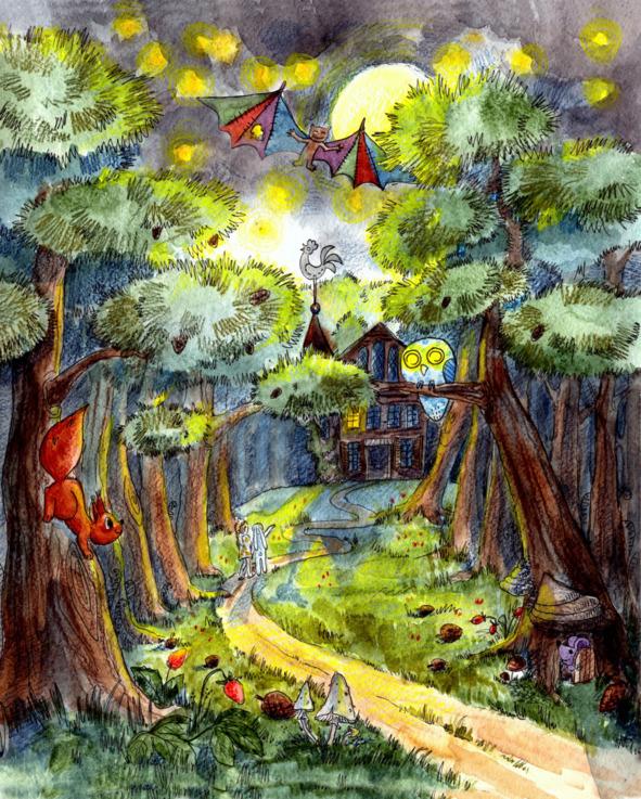 Васёнке стало спокойней, но ей хотелось спать. И вдруг где-то вдали она заметила слабый огонёк. Звезда? Но нет, темнота ещё не наступила, и звёзд не видно. А вдруг это ещё один гостеприимный дом? Васёна показала огонёк зайцу, и они двинулись сквозь чащу ему навстречу. Действительно, вскоре они вышли на поляну, посреди которой стоял большой, устрашающего вида дом из тёмных брёвен, поросших мхом и плющом. Он был трёхэтажный, покосившийся, достаточно громоздкий и нелепый. На втором этаже в одном из оконцев горел тусклый свет. Путники радостно подбежали к входной двери и постучали. В ответ услышали тишину. Васёна немного помялась у входа и толкнула дверь. Она оказалась не заперта. Ночные странники вошли в дом и увидели большой холл, а посреди него огромный дубовый стол с тремя стульями.