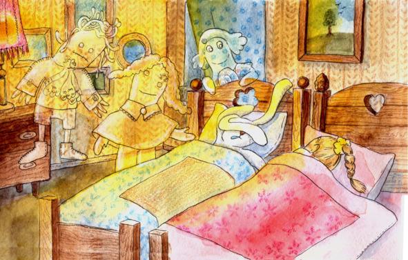Гости жутковатого дома посмотрели вверх и увидели, что в центре нет потолка, а через огромный круглый проём видны обрамляющие его резные перила. Васёна поднялась на второй этаж по скрипучим ступеням широкой покосившейся лестницы. Следом за ней поспешил и заяц. Они подошли к перилам, посмотрели сверху на столовую и отправились вдоль перил искать освещённую комнату. Дверей было всего три. Открыв первую же дверь, друзья сразу увидели свет. Вошли в комнату. Никого. Как и предполагалось, в комнате стояли три кровати. Усталые путники в обнимку улеглись на самую маленькую постельку и быстро уснули.