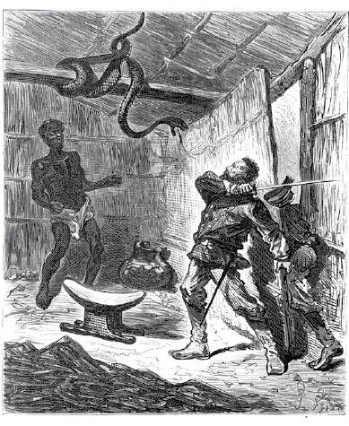И прокаженный рассказал своему гостю о том, что он умеет заклинать змей. Он знает, как заставить их явиться на его зов, он может не только безнаказанно их трогать, но и не боится их укусов, в том случае, если опасный гость случайно заденет его ядовитым зубом. Ему не страшна не только боисиненга, или каскавелла, но и куда более опасный граж и даже смертоносная ай-ай, названная так потому, что укушенный ею только и успевает, что испустить этот крик, перед тем как умрет.