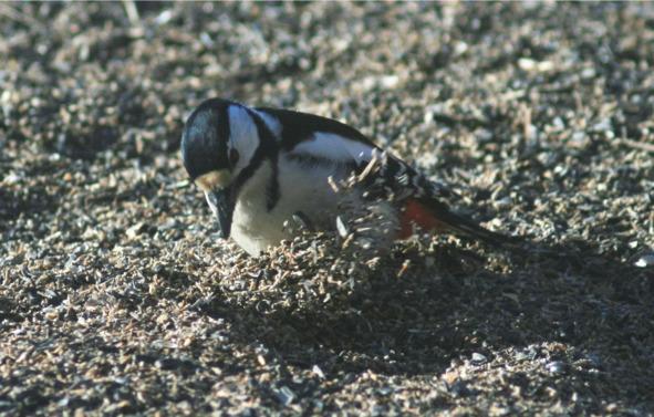 Его тоже привлекла обеденная суета на поляне. Но для себя дятел ничего здесь не нашёл. Потоптался на семенах, потоптался да и отправился обратно на дерево — искать личинки насекомых.