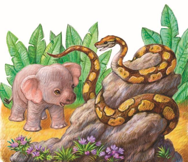 Первый, кто попался слонёнку на глаза, был двухцветный питон (огромная змея), обвившийся вокруг скалистой глыбы.