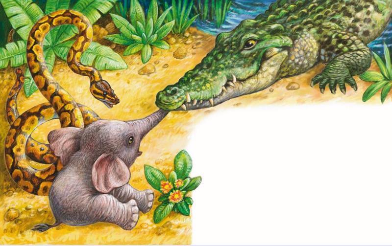 Он тянул, и слонёнок тянул, и крокодил тянул. Но слонёнок и двухцветный питон тянули сильнее. Наконец крокодил выпустил нос слонёнка с таким всплеском, который слышен был вдоль всей реки Лимпопо.