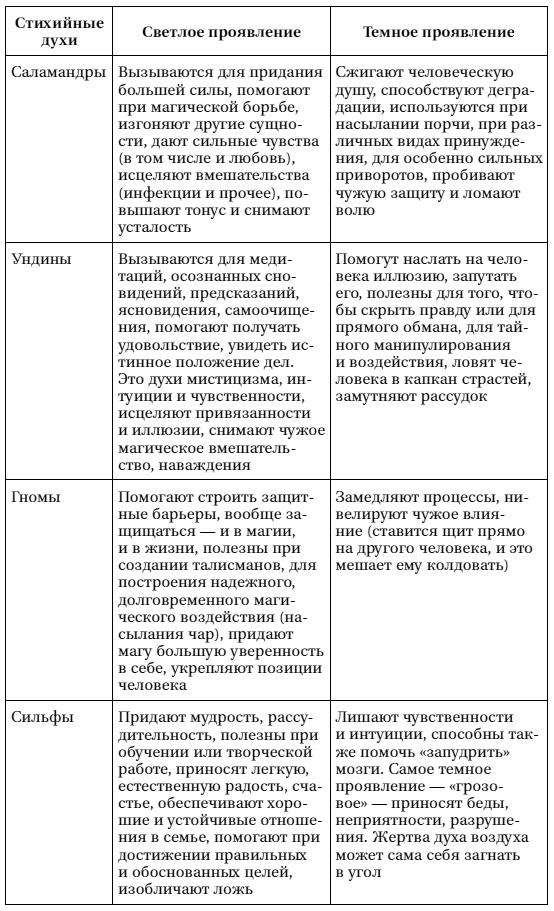Вот приблизительная таблица той магии, которой обладают стихийные духи. Темные и светлые проявления духа (вернее, темные и светлые духи одной Стихии) могут весьма сильно различаться между собой.
