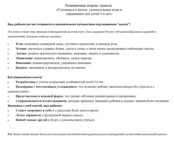 Готовим маленьких гениев к большим открытиям! Более 140 заданий помогут ребенку развить способности. Постепенное усложнение. Подготовка к школе. Что ребенок получит, выполняя задания? * Научится читать и писать * Повысит уровень концентрации внимания * Познакомится с окружающим миром * Получит заряд положительных эмоций Книга предназначена: Для родителей. Для педагогов дошкольного образования. Для учителей начальных классов.