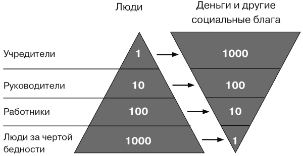 Безусловно, успешных людей меньшинство. Это очень легко проследить по схеме. Возьмем два равнобедренных треугольника. Первый – количество людей в процентах, второй, расположенный вершиной вниз – количество благ: здоровья, любви, успеха в обществе, материальных ценностей, свободы, власти и уверенности в завтрашнем дне. А теперь разделим их на четыре части (см. рис. 1.2).