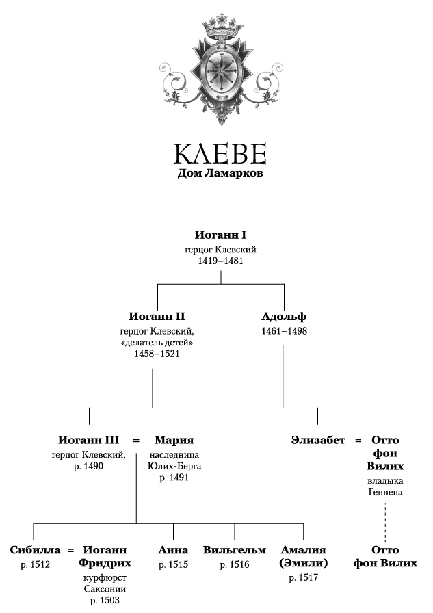 Каждое лето отец, известный подданным как герцог Иоганн III, перебирался с женой и детьми сюда, в Шваненбург — огромный дворец, построенный на крутом каменистом холме, который возвышался над могучим Рейном и славным городом Клеве. Сегодня к ним ненадолго приехали погостить дядя Отто фон Вилих, добродушный владыка Геннепа, и тетя Элизабет, никому не позволявшая забывать, что она дочь герцога Иоганна I. Они наверняка везли с собой Отто, дядиного побочного сына. Хотя двор Клеве имел репутацию места, где строго блюдут правила морали, бастардам здесь не отказывали в милостях. Дед Анны со стороны матери, герцог Иоганн II, имел тридцать шесть незаконнорожденных детей; не зря его прозвали «делатель детей». Умер он, когда Анне было шесть лет, так что помнила она его весьма смутно, тем не менее живые подтверждения дедовской необузданной плодовитости встречались ей при дворе и в домах клевской знати на каждом шагу. Казалось, она в родстве почти со всеми в находившихся под властью отца объединенных герцогствах и графствах Клеве, Марк, Юлих, Берг, Равенсберг, Зютфен и Равенштайн.