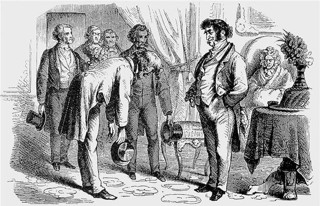 Некоторое представление о том, какого рода возражения против эмансипации выдвигали представители знати, можно найти в письмах дяди королевы, герцога Камберленда, который стал королем Ганновера. Отчасти он разделял точку зрения епископов, что «мысль о допуске… лиц, которые отрицают существование Спасителя» – «ужасна». Но отчасти его опасения были социальными по своей природе. Он предсказывал, что «постепенно все богатства страны перейдут в руки евреев, дельцов и коленкорщиков», и, говоря о больших амбициях евреев, приводил в пример приемы Амшеля во Франкфурте. Он знал, о чем говорил, так как всего за несколько лет до того ужинал в доме у Ханны. В тот период подобные проявления двуличного снобизма почти не отличались от грубых карикатур на данную тему. На карикатуре «Одно из преимуществ еврейской эмансипации» изображался старый тряпичник, который приносит домой жене молочного поросенка и восклицает: «Смотри, дорогая, что я тебе принес! Благодаря барону Ротшильду и де Пилю» (см. ил. 1.2).