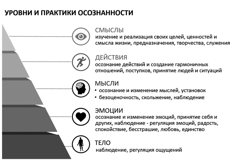 Схема «Уровни и практики осознанности» показывает, в каком направлении строится работа на каждом уровне (рис. 1.2). В этой книге вы найдете примеры, упражнения, практические советы для всех уровней.