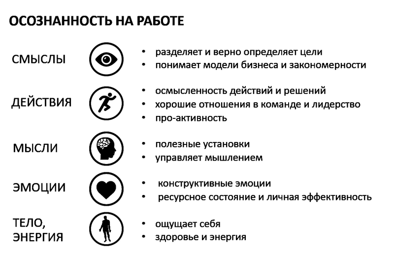 Интересно, что осознанность в последнее время – модный тренд в сфере не только личностного, но и корпоративного развития. Многие организации стали обучать осознанности своих сотрудников. И это только начало, ведь компании поняли, что осознанный человек гораздо эффективнее. Почему это так, понятно из схемы «Осознанность на работе» (рис. 1.3).