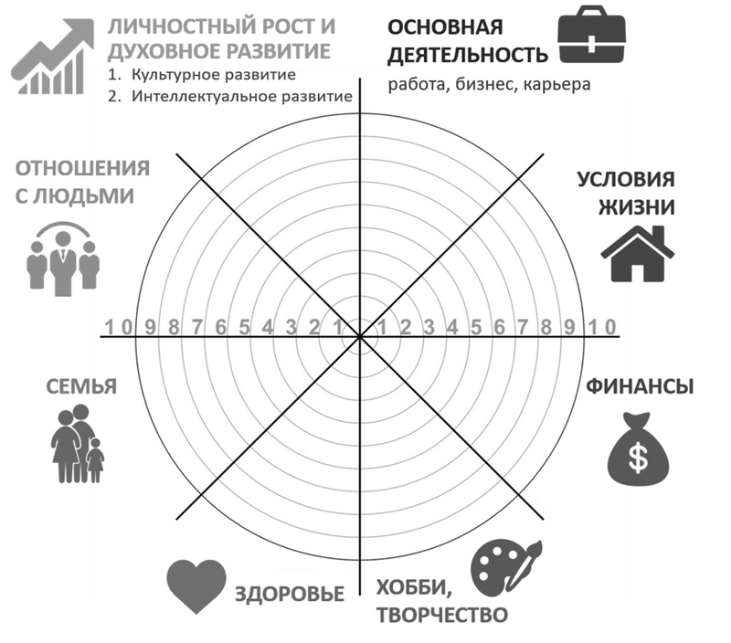 2. Отметьте на каждой шкале желаемое состояние: отметьте, сколько (от 0 до 10) вы хотели бы иметь в каждой области.
