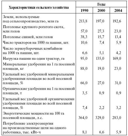 Развал в сельском хозяйстве страны в 1990-е годы оказался масштабным и многоплановым [Абалкин, 2009]. В 1990–2004 гг. нисходящую динамику демонстрировали буквально все значимые характеристики сельхозпроизводства: площадь сельхозугодий, численность поголовья скота, материально-техническая база сельского хозяйства (табл. 1).