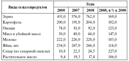 Однако ситуация с потреблением продовольствия в стране оставалась напряженной. Трудно поверить, но факт: объем производства молока в 2008 г. был сопоставим с его уровнем в 1958 г., мяса в целом – в 1970 г., яиц – в 1977 г. А поголовье КРС было как после коллективизации в 1933–1934 гг. [Интервью с Ушачевым, 2009]. Лишь картофель и хлебопродукты россияне потребляли с превышением рациональных норм питания. Среднедушевое потребление мяса и мясопродуктов составляло от нормы всего 61 %, рыбной продукции – 56 %, овощей – 76 %, молока и молокопродуктов – 88 %. Конечно, высокодоходные группы потребляли больше. Но в целом в 2008 г. ниже рациональной нормы потребляли молока и молокопродуктов примерно 80 % населения страны, мяса и мясопродуктов, рыбы и рыбопродуктов – 50–60 %, фруктов – 70 %, сахара – 30 %, хлеба и хлебных продуктов – 20 %. Но даже этот уровень потребления достигался с помощью импорта.
