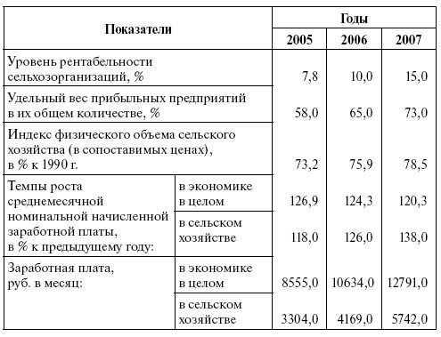 Положительные тенденции в аграрном секторе набирали силу. Удельный вес прибыльных предприятий за 2005–2007 гг. вырос с 58 до 73 %, уровень рентабельности повысился с 7,8 до 15 %. По темпам роста заработной платы сельское хозяйство начало опережать другие отрасли экономики. Однако в абсолютном выражении зарплата оставалась низкой: в среднем около 6 тыс. руб., т. е. в 2 раза ниже, чем в целом в экономике страны (табл. 4).