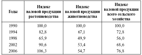 Индекс валовой продукции сельского хозяйства за период 1990–2006 гг. (в сопоставимых ценах, % к 1990 г.)
