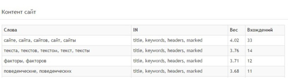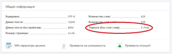 Как мы видим, тошнота контента на странице равна 5,7%, это хороший показатель. Заметим, что пределом для этого показателя является уровень в 8%. То есть тошнота в 10% и выше дает поисковику основания считать текст переспамленным.