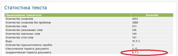 При анализе чистого текста (без включения мега-тегов и прочих текстовых элементов страницы) мы получаем значение 8,7%. Уровень «тошноты» не превышен.