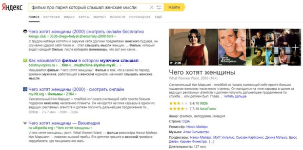 Яркий пример того, как поисковики работают сейчас: попробуйте ввести в строку поиска «фильм про парня который слышал женские мысли».